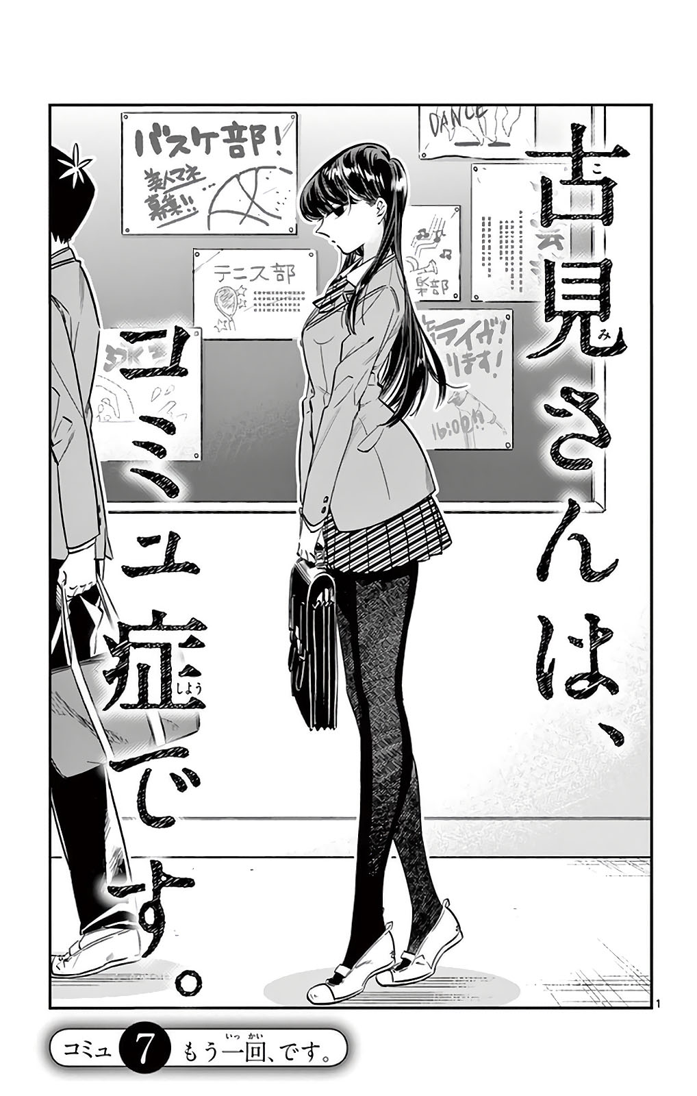 Tadano Hitohito and Komi Shouko walk to class, and Tadano internally admires Komi's features and beauty. He suddenly realizes he accidentally called out Komi's name and awkwardly tries to change the subject by encouraging her to practice asking someone for friendship, as crossing this step would drastically speed up her process in making many friends. Komi, happy with the idea, attempts to speak, but she stiffens like a rock. Although they both understand Komi's predicament, her desire to properly communicate helps them resolve to keep going and try again.